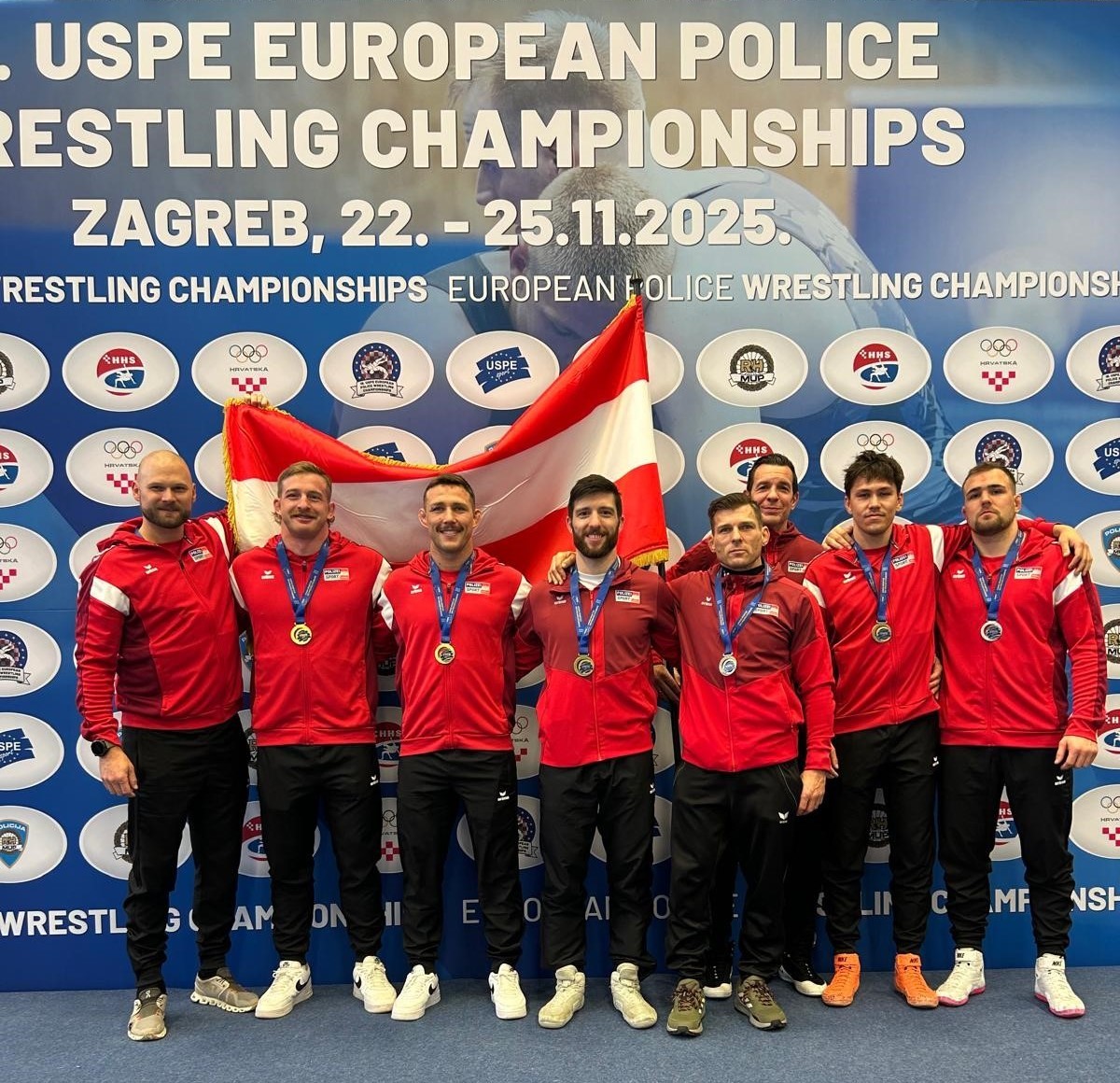 | Vom 23. – 24. November fand in Zagreb/Kroatien die Polizei Europameisterschaft der Männer in Gr.-Röm und Freistil statt. Das ÖRSV-Team zeigte eine geschlossene Mannschaftsleistung und konnte 3 Polizeieuropameistertitel und 5 weitere Medaillen erringen. In der Mannschaftswertung Freistil belegte unser Team den 3. Platz und in Gr.-Röm den 4. Platz. Betreut wurde das Team vor Ort von Martin Schlagenhaufen.