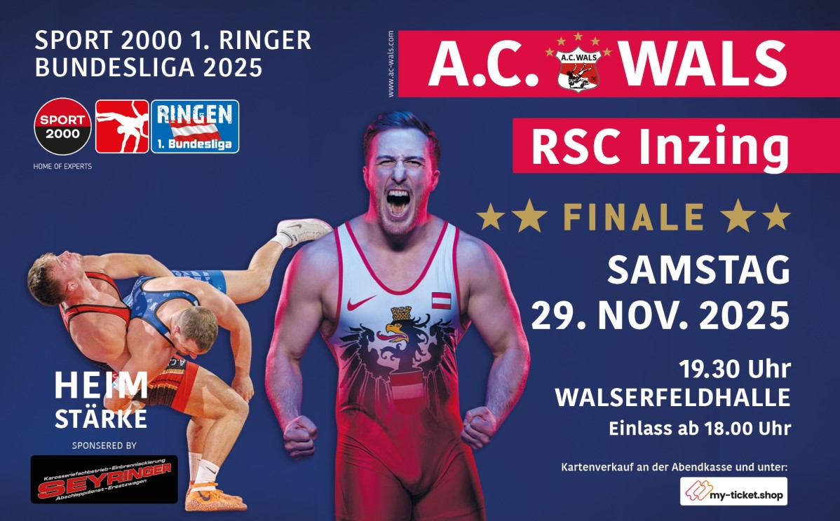 Am 29. November 2025 steht die Walserfeldhalle ganz im Zeichen des großen Showdowns der 1. Sport 2000 Ringer-Bundesliga: Der zweite und alles entscheidende Finalkampf zwischen dem RSC Inzing und dem A.C. Wals verspricht Spannung pur. Im ersten Duell setzte sich der RSC Inzing nach einem hochklassigen Kampf knapp mit 25:21 durch und geht damit leicht favorisiert in das Rückmatch. Für den amtierenden Meister A.C. Wals zählt nun nur eines: den Rückstand zu drehen und den Titel erfolgreich zu verteidigen.